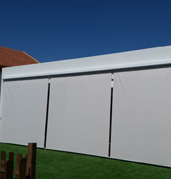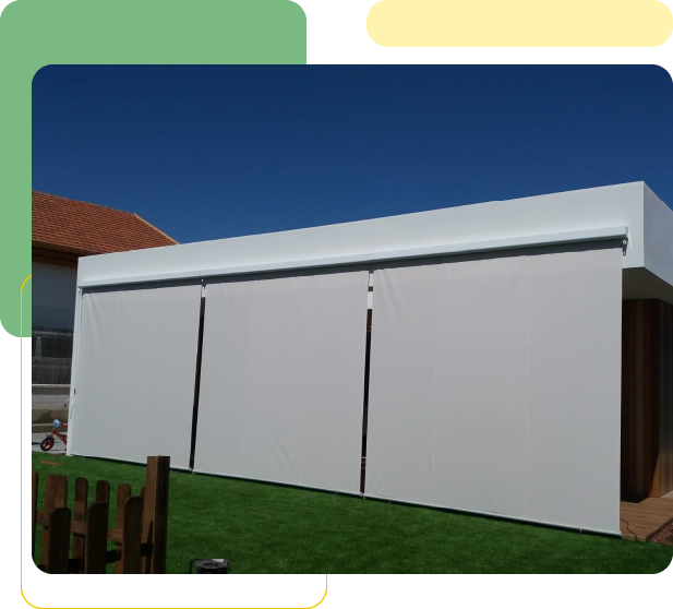 Toldos enrollables en vertical para múltiples usos. Cerramientos de terrazas, tanto en chalets como en bares, cerramientos de pérgolas, separación y ocultación de zonas, habitaciones… etc.